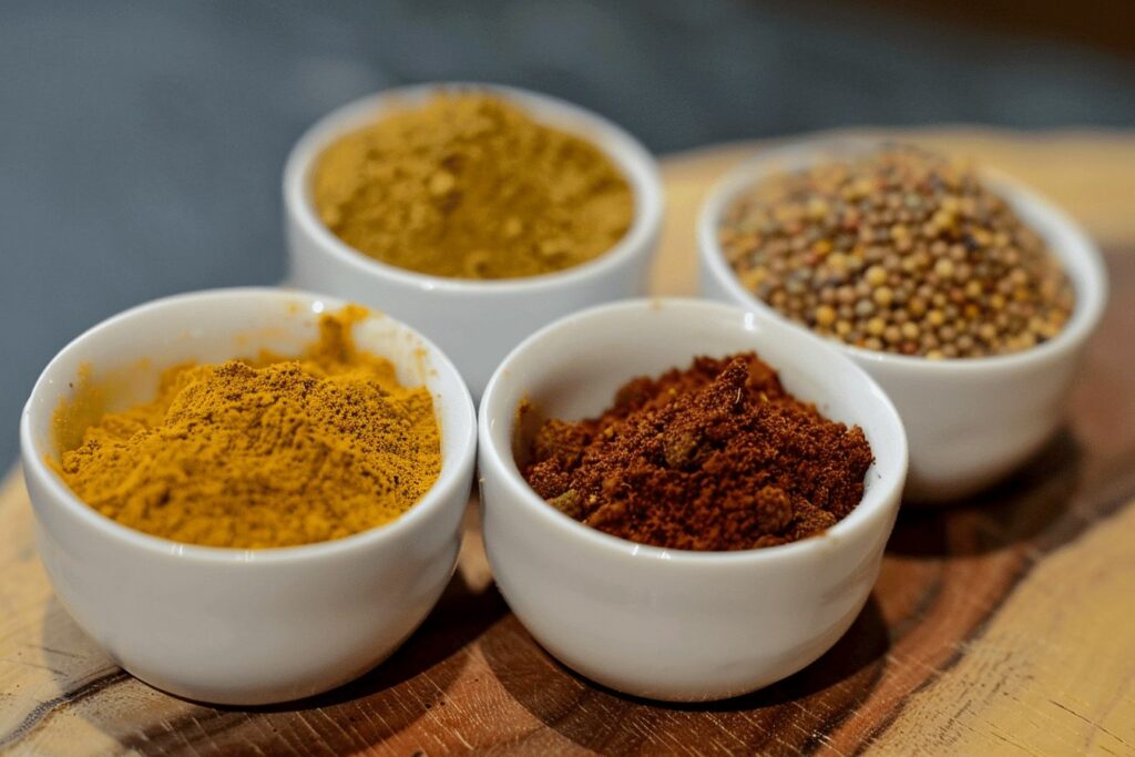 Les épices telles que le curry en poudre, le cumin, le curcuma, le paprika et la coriandre moulue ne sont pas seulement ajoutées pour leurs saveurs, mais aussi pour leurs bienfaits pour la santé. Le curcuma, par exemple, est connu pour ses propriétés anti-inflammatoires et antioxydantes grâce à la curcumine. Le cumin aide à la digestion, tandis que la coriandre peut aider à réduire les niveaux de sucre dans le sang.