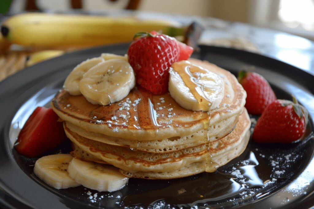Servez ces pancakes avec des fruits frais pour augmenter l’apport en fibres et vitamines. Les fruits comme les baies, les tranches de pomme ou de poire apportent des antioxydants et des vitamines supplémentaires. Du sirop d’érable, riche en antioxydants et minéraux comme le zinc et le manganèse, ou du yaourt végétal pour des probiotiques bénéfiques pour la digestion, peuvent aussi être ajoutés pour un petit-déjeuner complet et délicieux.