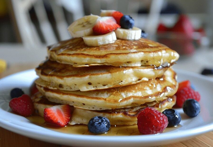 - Servir : Répéter avec le reste de la pâte. Servir les pancakes chauds, garnis de sirop d’érable, de fruits frais et de noix si désiré.