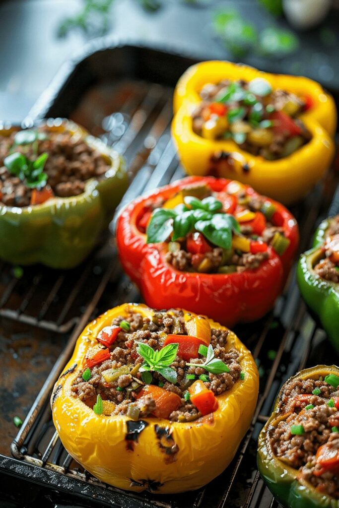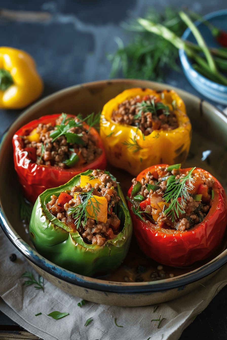 Pour un repas encore plus complet, servez ces poivrons farcis avec une salade fraîche composée de roquette, de concombres et de tomates cerises, arrosée d’une vinaigrette légère au citron.