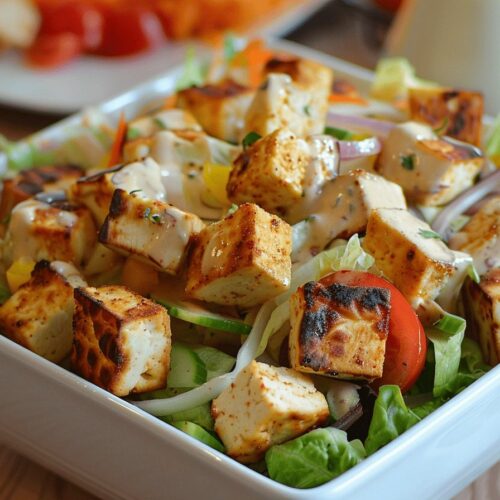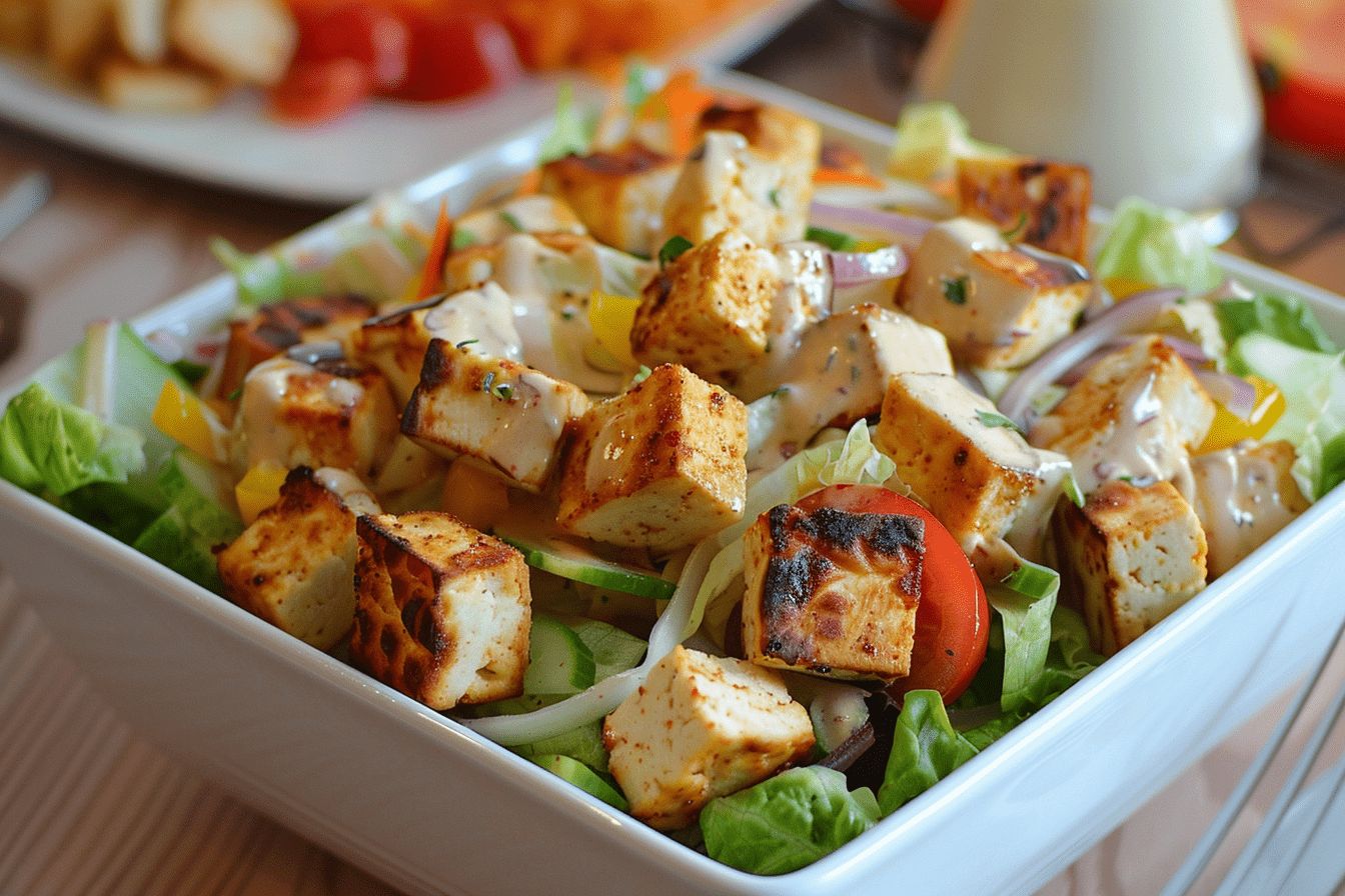 - Ajouter le tofu : Disposer les cubes de tofu grillé sur la salade.